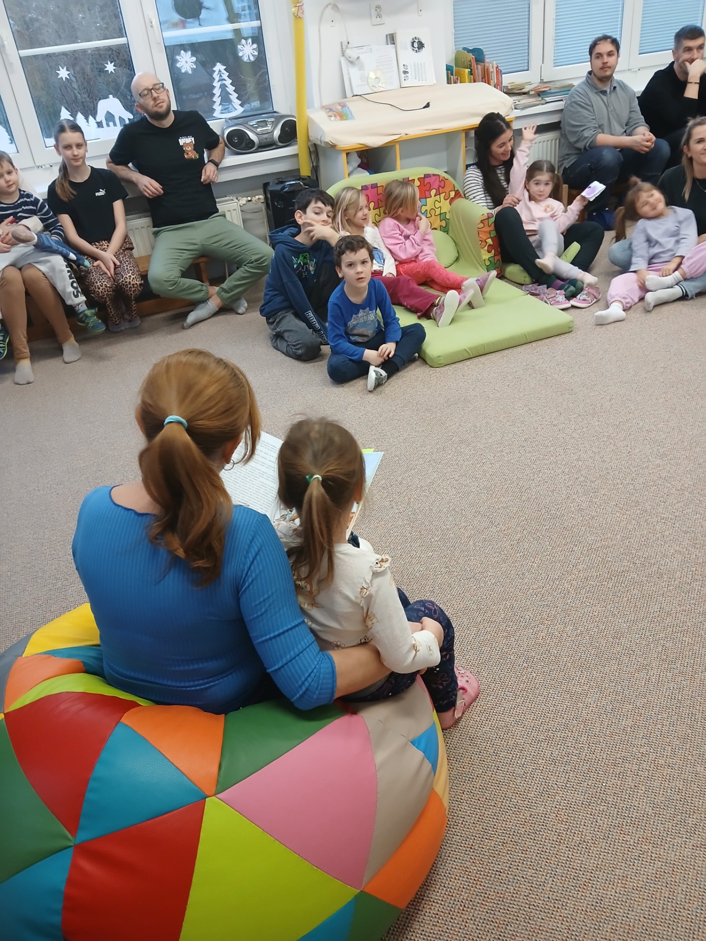 V úterý 3. února proběhlo další z příjemných odpoledních setkání. Přečetli jsme si Človíčkův příběh o ptačím zimováním. Děti při společné hře s rodiči sbíraly do krmítka zobání pro ptáčky, zatančili si spolu tanec vrabce a sýkorky. Děti také zatančily rodičům vrabčí písničku i novou veverčí. Závěr se nesl v připomenutí našich lednových školkových...